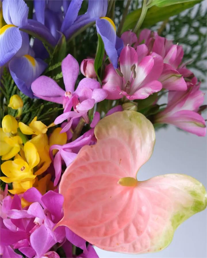 Subject to market availability this arrangement includes Mokara Orchids, Lily, Iris, Alstroemeria and Anthurium with Cypress foliage.