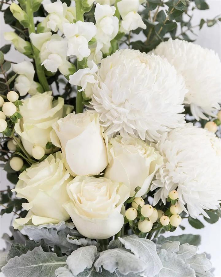Subject to market availability this arrangement includes design includes white Roses, Chrysanthemum Disbuds, & Snapdragons, all styled with Eucalyptus foliage.