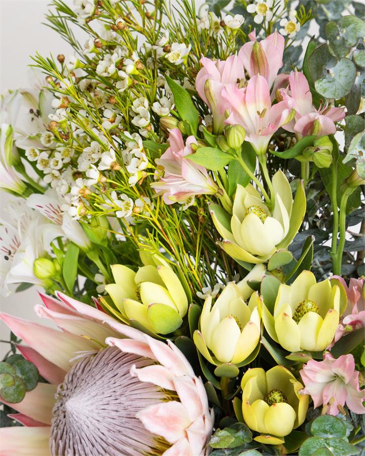 Subject to market availability this arrangement includes King Protea, Alstroemeria, Geraldton Wax, Leucadendron and Eucalyptus.